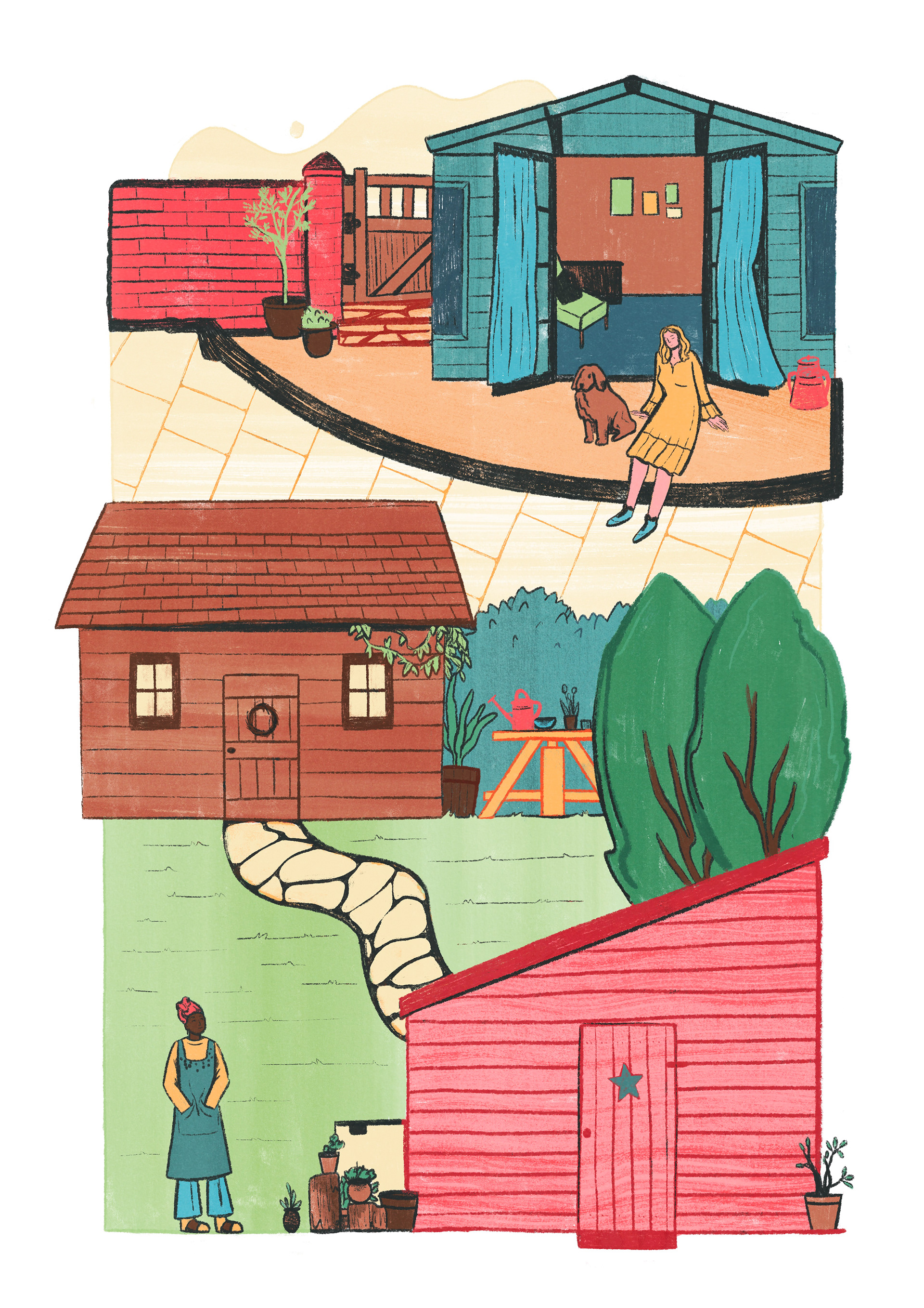 Speculative editorial illustration for an article on women reclaiming their sheds as space for hobbies and relaxation.
